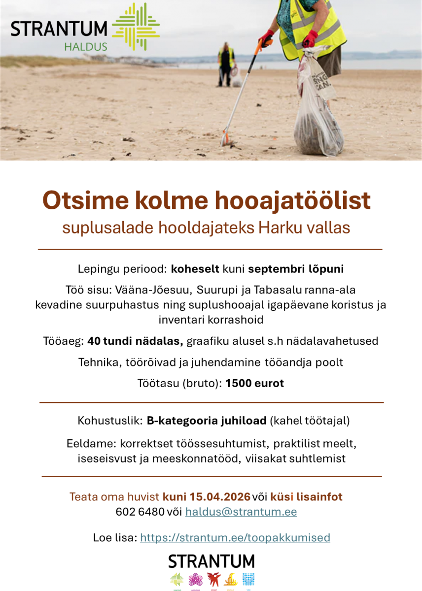 Otsime kolme hooajatöötajat Harku valla suplusalade hooldajateks Loe lisa: https://strantum.ee/toopakkumised