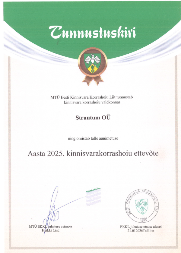 Aasta 2025 kinnisvara korrashou ettevõtte tiitli pälvis Strantum OÜ ning aasta heakorraspetsialistina tõsteti esile meie Riina Bachmann.